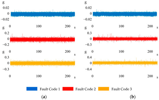Ensemble views of raw vibration signals in (a) horizontal and (b) vertical directions.