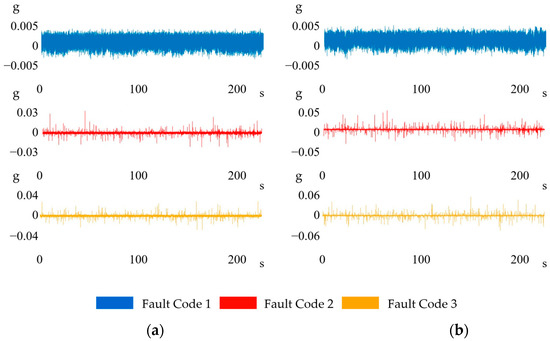 Ensemble views of the raw and low-pass-filtered vibration signals under the three load conditions are presented in Figure 5 and Figure 6, respectively. Because the rotor–bearing system exhibited greater stiffness along the horizontal axis than along the vertical axis, the vertical channel consistently registered larger vibration amplitudes. In addition, the low-pass filter effectively attenuated the broadband high-frequency noise present in the raw data. Consequently, classification models trained on the vertical signals attained superior accuracy compared with the models trained on horizontal signals.