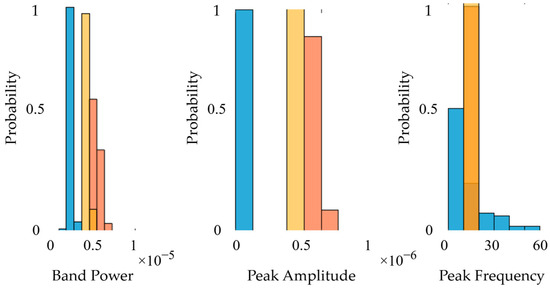 The feature histograms for feature set F7 with normalised probability values showing the concentration of data points within certain intervals, where it can be observed that the features do not have a normal distribution, are shown in Figure 7. The feature ranking results obtained by the Kruskal–Wallis ranking algorithm are given in Figure 8, and, according to the feature ranking results, the features used for classification are given in Table 5.