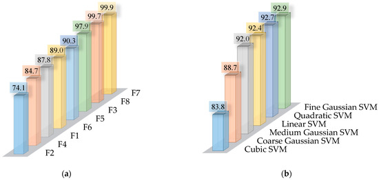 Among the kernels tested, the fine Gaussian SVM provided the best overall performance with an average accuracy of 92.9%, while on the other hand, the Cubic SVM provided the worst overall performance, with an average accuracy of 83.8% (Figure 9b). The highest classification accuracy of 100% was achieved with the linear SVM, cubic SVM, medium Gaussian SVM, and coarse Gaussian SVM using feature set F7, and with the linear SVM using feature set F8; on the other hand, the lowest classification accuracy of 60% was obtained with the cubic SVM using the F2 feature set. To further elucidate the performance differences among kernels, in the fine Gaussian SVM, the fine Gaussian kernel, with its smaller kernel width, effectively adapted to both clearly separable (F7) and complex feature distributions (F2). Although it did not achieve the highest single-set accuracy (100%), it consistently demonstrated strong performance and flexibility across diverse feature sets, resulting in the highest overall mean accuracy (92.9%). The quadratic SVM, employing a second-degree polynomial kernel, achieved a relatively high average accuracy of 92.7%. It successfully modeled moderate non-linearities but lacked optimal adaptability for highly intricate distributions. The Linear kernel achieved perfect classification accuracy (100%) on the linearly well-structured feature sets F7 and F8. However, its inherently simpler structure resulted in reduced adaptability to more complex, overlapping feature distributions, thereby producing comparatively lower accuracy on challenging sets, such as F2. The medium Gaussian kernel balanced kernel locality and smoothness effectively, reaching perfect accuracy (100%) for clearly separable features in F7. Although its broader kernel width resulted in slightly lower accuracy on more complex distributions (e.g., F2) compared to the fine Gaussian kernel, it still provided stable and reliable performance. On the other hand, with its larger kernel width producing smoother decision boundaries, the coarse Gaussian kernel excellently handled distinct feature clusters (F7), achieving perfect accuracy (100%). Nevertheless, this kernel exhibited limited flexibility for distinguishing closely spaced features in more complex sets, resulting in slightly reduced overall performance relative to the fine and medium Gaussian kernels. As for the cubic SVM, Despite being able to model moderate non-linearities due to its third-degree polynomial structure, the cubic kernel significantly struggled with complex, overlapping distributions, especially evident with feature set F2. This limitation resulted in the lowest overall average accuracy (83.8%). Consequently, if the chosen kernel function does not align sufficiently well with the feature-space geometry, classification accuracy may decrease.