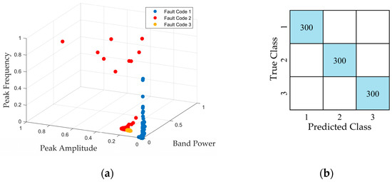 The scatter plots and confusion matrix obtained with the linear SVM, cubic SVM, medium Gaussian SVM, and coarse Gaussian SVM classifiers using feature set F7 are given in Figure 10. The Kruskal–Wallis ranking results showed that PA was the most discriminative feature, followed by BPWR and finally PF. This can also be clearly seen in the scatter plots. According to the confusion matrix, the recall and precision values are 100%, and the F1 score is 1 for each class. Thus, all three different operating conditions were classified with 100% accuracy.