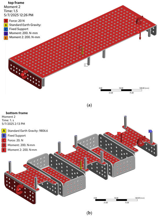 Finite element analysis (FEA) setup in Ansys Workbench 2024 Static Structural Environment. (a) Boundary and constraint conditions for the upper frame. (b) Setup configuration for the lower frame.