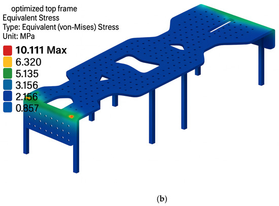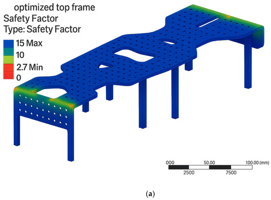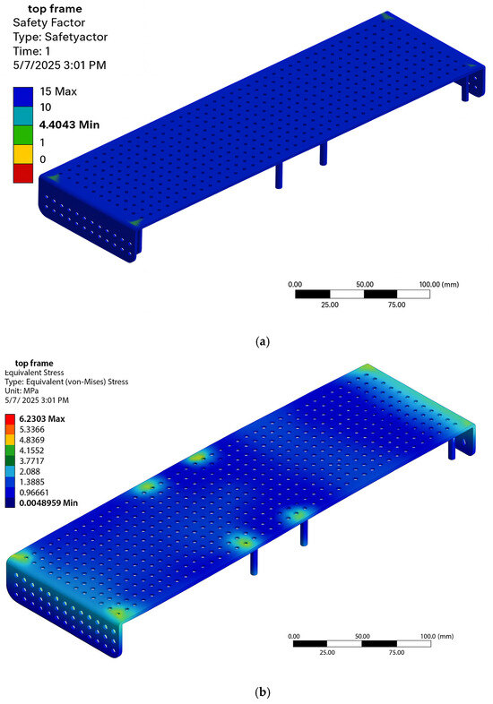 These results confirmed the feasibility of applying topology optimization to reduce structural weight and enhance the system’s energy efficiency. The safety factor and von Mises stress distributions for the upper frame are shown in Figure 3.