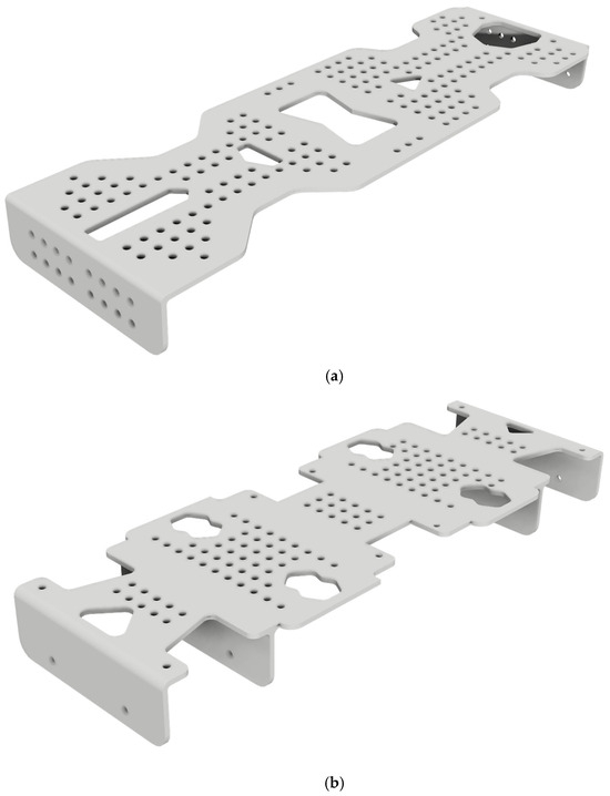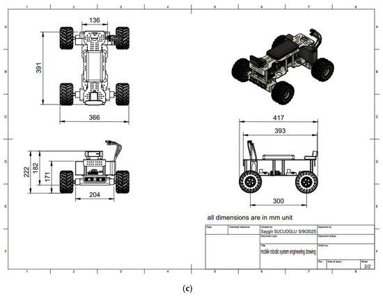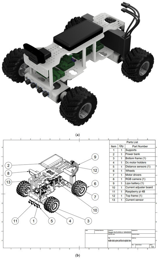 The parametric solid modeling of the mobile robotic system was conducted using Fusion 360 (v.2603.1.15) software. In the initial stage, the primary structural components, namely the main frames and support elements, were designed. Mounting regions and connection holes were integrated into the overall assembly model.