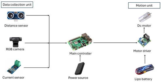 The collected data formed the foundation for the machine learning-based energy-efficient path planning model. A schematic representation of the system’s hardware architecture is shown in Figure 6.