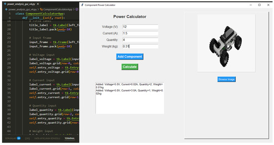 The power analysis tool (Figure 7) was developed to facilitate the evaluation of energy consumption in mobile robotic systems. It features an intuitive graphical user interface (GUI) built using Python’s Tkinter library (v3.13.5).