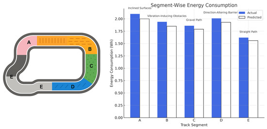 Track layout with labeled terrain segments (A–E) and corresponding energy consumption profiles. The bar chart compares actual and predicted energy usage per segment, demonstrating model accuracy across various terrain types, including inclined surfaces, vibration-inducing obstacles, gravel path, direction-altering barriers, and a flat control segment.