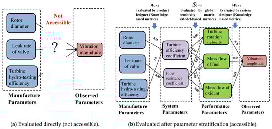 Knowledge-based correlation is utilized to obtain weights between system parameter nodes and performance parameter nodes, as well as weights between performance parameter nodes and observed parameter nodes. It cannot be obtained through simulation and can only rely on engineering experience. The correlation is acquired through evaluation by multiple product engineers and system engineers, following the rules listed: (1) the more senior the expert, the higher the weight of his evaluation score; (2) the correlation between manufacturing process parameters and system parameters is evaluated by product engineers. Meanwhile, the correlation between performance parameters and observed parameters is evaluated by system engineers. The knowledge-based correlation is defined as