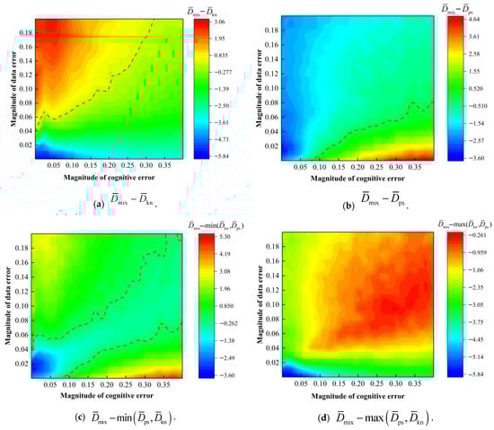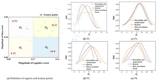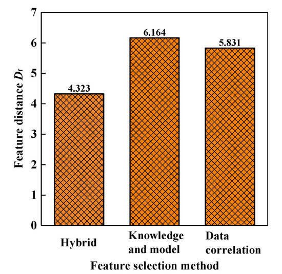 Next, build the knowledge-based correlation matrix (size of 18 × 4, 2 × 1) and model-based sensitivity matrix (size of 4 × 2). Calculate the corresponding feature distances Df using data-based, knowledge and model-based, and hybrid feature selection methods, as shown in Table 3. It can be seen from Figure 7 that, under ideal conditions (i.e., no noise in the data, no significant errors in domain knowledge, and accurate simulation models), the feature distance of the hybrid feature selection method is slightly smaller than that of the single standard feature selection method. This is because the knowledge-based method underestimated the importance of “the flow resistance constant of the thrust regulator valve”, while the data-based method failed to identify the important feature “initial volume of fuel tank ullage”. After weighting the two metrics, the feature scoring errors of the two methods were complementary, thus improving the feature selection results.