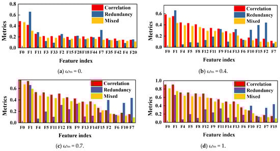 Next, optimize the feature subset based on the calculation methods of multiple evaluation metrics mentioned above. The optimization of feature subsets can be regarded as the process of selecting the best k (1 ≤ k ≤ M) features from M original features for predictive model construction. Currently, the mainstream feature subset selection methods include filter, wrapper, and embedded methods. In this paper, the straightforward feature selection algorithm [] with the maximum relevance and minimum redundancy rule [], which belongs to filter methods, is used to determine feature rankings, and then the wrapper method is used to determine the fusion weighting coefficient ωm and the feature subset length k. The specific steps of the algorithm are as follows: (1) Define the best feature set and the feature set to be selected f = {f1, f2, …, fM}. (2) Add the feature f1 with the highest correlation with the dependent variable in the f to S0 to form S1, and remove f1 from f. (3) Select the next best feature f2 from f according to the feature subset scoring function J(f, ω) to join S1 to form S2, and remove f2 from f. (4) Repeat step 3 until f is an empty set. At this point, a re-sorted feature set S|f| will be obtained. (5) Select the top k features as the feature subset.