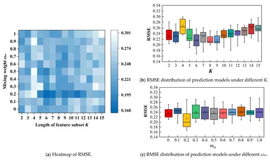 where RMSEω,k represents the root mean square error of the model with fusion weighting coefficient ωm and feature subset length K.