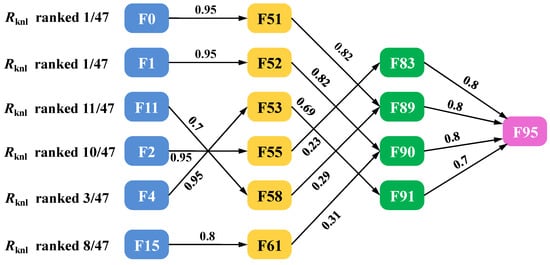 It is noted that the total weight is calculated by multiplying the weights of each path instead of summing them up. This is because there are causal relationships between parameters at different levels. When the expert knowledge-based correlation is 0, it means that the designer is very confident that there is no correlation between the parameters. Summing up the weights will result in ‘fake correlation’ on the path containing these two nodes. In addition, there may be more than one path between two nodes. Therefore, the maximum total weight among all paths is selected as the final correlation metric between the two nodes, as shown in Equation (3).