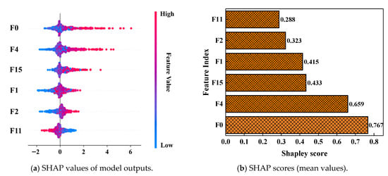 where Zs′ represents the set of non-zero elements in Z′. Under the assumption of feature independence, the expected value of the prediction for the set of zero elements (representing the unselected feature set) can be estimated through sampling. When interpreting the model, the SHAP values for all features are first calculated for each sample, and the influence of each feature on the prediction value when it changes around the mean is observed, that is, . Finally, take the average of the SHAP values of all samples on every feature to obtain the corresponding feature contribution under different inputs, as shown in Equation (26).
