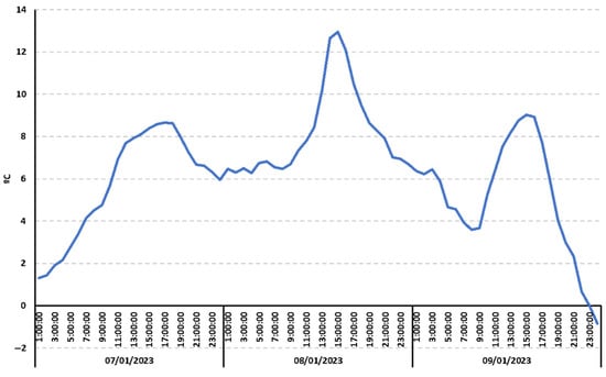 Evolution of outside temperatures in Leon City during the 7th, 8th, and 9th of January, 2023. Own elaboration. Data from [].