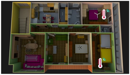 Room 1 is a double bedroom with an approximate area of 20 m2, Room 2 is a single bedroom with an approximate area of 14 m2, and the volume of treated air is 48.0 m3 and 33.6 m3, respectively. Figure 4 shows a 3D-rendered view illustrating the rooms, their surface areas, and the location of the temperature sensors, valves, and smart plugs installed in the areas under analysis, generated using the HA software (version 2023.1) employed in the research.