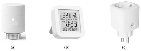 IoT’s smart equipment: (a) smart thermostatic valves; (b) smart temperature and humidity sensor; (c) smart Wi-Fi plug. Image adapted from the web.