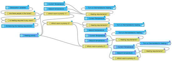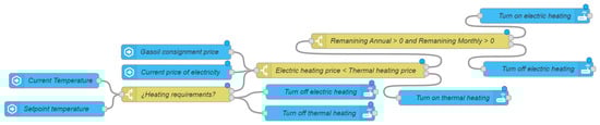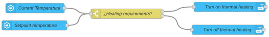 Home Assistant’s advantages include its open-source nature, which means it is free and highly customizable to suit individual needs. In addition, it offers integrations with a wide range of devices and services, providing a seamless home automation experience. However, some disadvantages may include a learning curve for novice users and the need for some technical knowledge to set up advanced integrations. Despite these drawbacks, Home Assistant remains popular for those looking for comprehensive, personalized control of their smart home devices. In addition, implementing the Node-RED extension is proposed as an effective solution for process automation. Node-RED is an open-source visual programming platform that allows for the creation of automated workflows by connecting different nodes or code blocks []. This functionality is especially useful in the case of home heating management since it allows for the creation of automatic workflows to control energy consumption, among other relevant aspects.