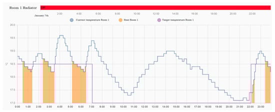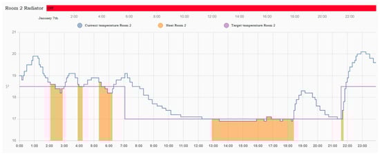 In Figure 13, it can clearly be seen when the electric heating is switched on (green zone in the upper bar). The electric radiator is switched on between 10:00 p.m. and 11:00 p.m. and between 2:15 a.m. and 3:30 a.m.