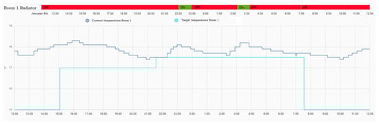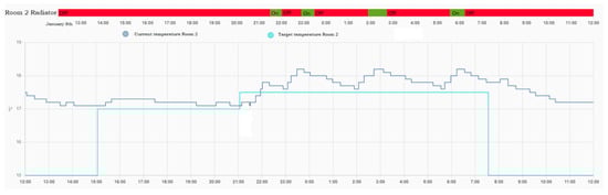 Table 5 shows the evolution of the price of electricity in a 24 h interval from midnight on January 8th to midnight on the 9th. The cost shown for heating each room is obtained by multiplying the price of electricity at that specific time by the operating time (the radiator’s power is 1 kW). As can be seen, the cost for the period considered is 0.1691 EUR for Room 1 and 0.1036 EUR for Room 2.