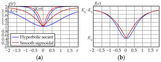 where 1 ≤ g(e) ≤ 2. Hence, the proportional gain is K0 for g(e) = 1 and K0 + K1 for g(e) = 2. Moreover, the idea is that g(e) = 1 for e = 0, which corresponds to the standard PID controller, and g(e) = 2 for e = ±∞. Thus, the controller has a large gain when the control system is far away from the operating point, and the gain is gradually reduced as the system approaches the operating point. There are several functions that satisfy the conditions imposed on g. The most common are, for instance, the hyperbolic secant function and the smooth sigmoidal function [35], whose implementation can be