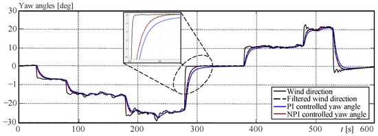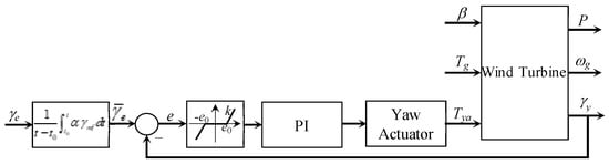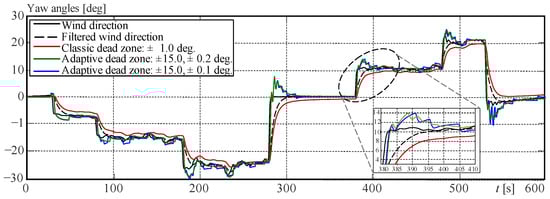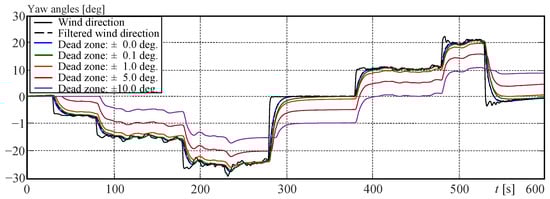 A controller with a dead zone [40] is commonly utilised to implement a conventional yaw control loop. Due to the dead zone, the controller is only activated when the control error overflows the predetermined threshold given by the dead zone, and its purpose is to return the operation to the region [41]. As the reference to be tracked, a weighted averaged wind direction signal, , is used, which is derived from a wind vane placed at the rear of the nacelle and a low-pass filter. The control system scheme is shown in Figure 4.