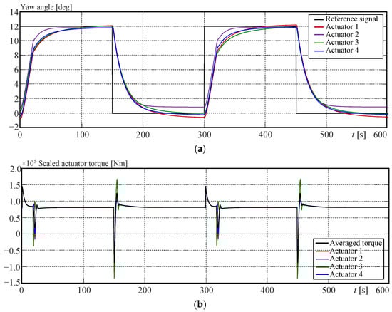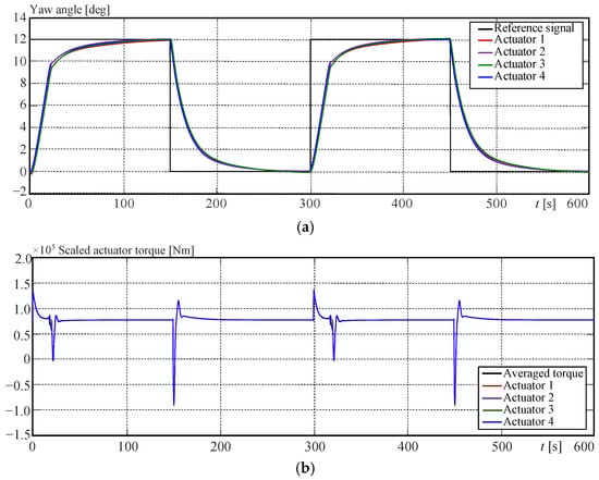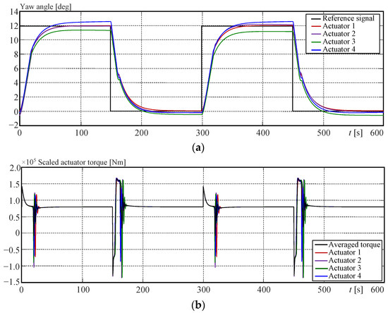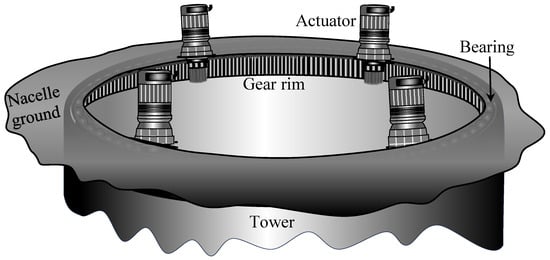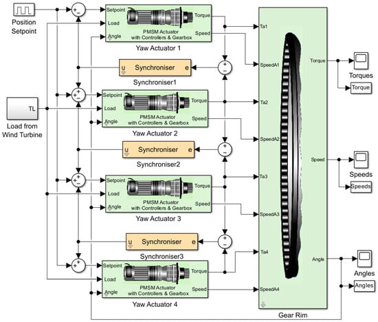 The control signal provided via the yaw controller goes to the yaw actuator. On the other hand, very large machines require attaching several actuators to the yaw gear rim in order to complete the torque that is necessary to rotate the nacelle and the rotor. Although all of these actuators can belong to the same type and series, they have differences, which can produce torque disbalances around the gear rim. This work condition for the actuators can lead to the irregular and forced operation of the motors at different internal conditions, as well as bearing and gear rim wear. Hence, the matter is a multimotor synchronous control problem [19,20,21]. This topic has recently been presented in [22] for pitch actuators, for which a particular approach to cross-coupled control [23,24] based on the studies described in [25,26,27,28,29] is used.