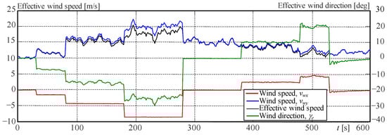 The wind turbine simulations take place in OpenFAST V4.1.0 from NREL (formerly known as FAST [43]). The wind speed is chosen to be stepwise with 5% turbulence in the x- and y-directions changing between 12 and 22 m/s (see Figure 10).
