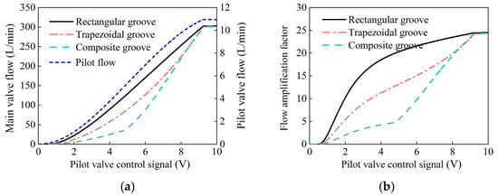 - Two groove profiles are designed: trapezoidal and composite. Simulations show that conventional rectangular grooves produce near-linear flow rate vs. signal relationships; trapezoidal grooves exhibit monotonically increasing flow rate gain; composite grooves generate dual-regime curves with distinct linear regions before/after transition points. Moreover, larger feedback groove area gains improve main spool response speed.