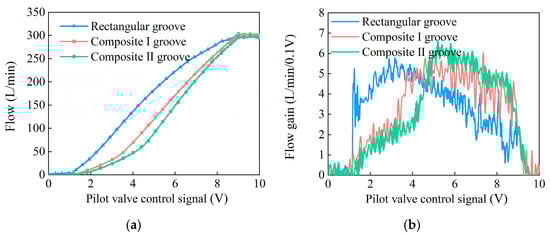 - Comparative experiments show the composite-groove spool achieves segmented flow characteristics (micro-motion and rapid actuation regions). Its flow gain in the micro-motion region (2.04 L/(min·0.1 V)) is 61.9% lower than that of conventional rectangular grooves, effectively improving micro-motion performance.