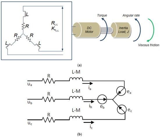 The BLDC motor schematic diagram and equivalent circuit are shown in Figure 1a,b, respectively.