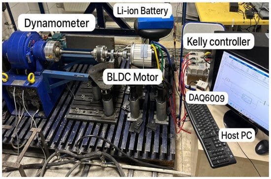 Figure 2 shows the complete experimental setup used in this study. The system consists of a 2.2 kW three-phase BLDC motor, whose detailed specifications are provided in Table 1. A Kelly KLS12301-8080I motor controller (Kelly Controller Inc., Shanghai, China) was employed to drive the motor and monitor key parameters such as motor speed, battery voltage, and current. The controller was configured through its proprietary software interface to operate in speed control mode using a 0–5 V analog throttle input. Key input parameters included current limits, maximum speed, number of motor poles, and protection settings such as undervoltage cutoff and regenerative braking.