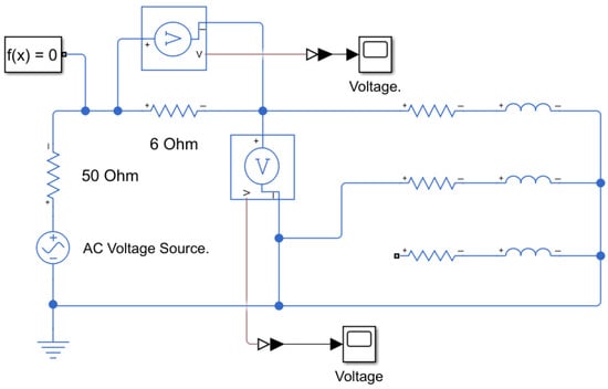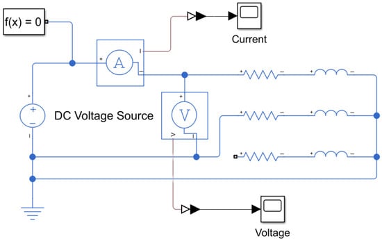 The phase inductance of the BLDC motor was experimentally measured by applying a variable AC voltage at 60 Hz across two of its terminals using a function generator with an internal resistance of 50 Ω. A 6 Ω resistor was connected in series with the motor terminals, as illustrated in Figure 4. The voltage drop across the 6 Ω resistor was measured at each step to calculate the total current flowing through the circuit. To ensure the accuracy of the inductance measurements and eliminate the influence of back EMF, the rotor was mechanically locked during testing.