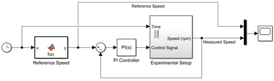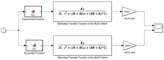 The identified transfer function of the BLDC motor was implemented in MATLAB/Simulink for validation. During this stage, sinusoidal and exponential input signals were applied to both the model and the BLDC motor in order to enable a smooth and controlled comparison between simulated and experimental responses. These continuous waveforms facilitated accurate evaluation of the transfer function without introducing abrupt transients that could lead to nonlinear effects or excessive current surges in the open-loop configuration. In contrast, step input signals were later utilized during the closed-loop control experiments, specifically as reference speed commands, to assess the controller’s ability to track sudden changes in speed. This approach allowed for a comprehensive evaluation of the system’s tracking performance under practical operating conditions.