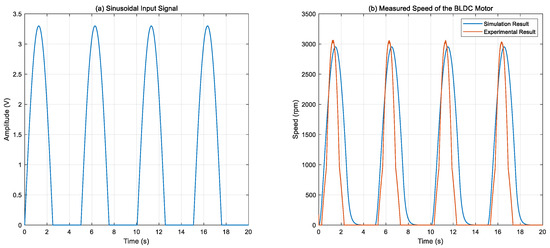 Simulated and experimental motor speeds under a sinusoidal input signal. (a) Sinusoidal input signal, (b) measured speed of the BLDC motor.