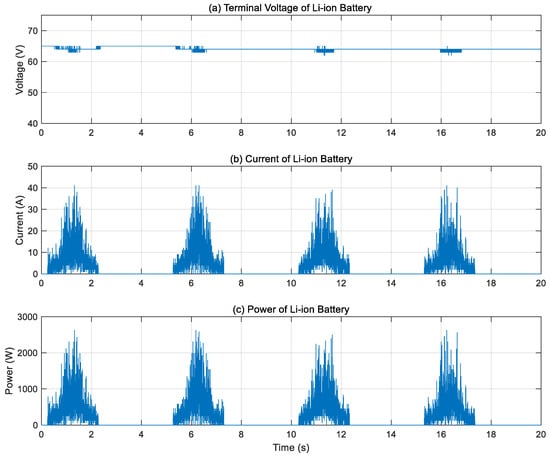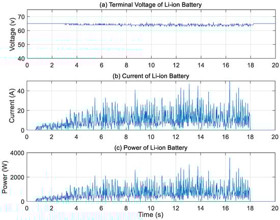 Li-ion battery performance. (a) Terminal voltage, (b) battery current, (c) battery power.