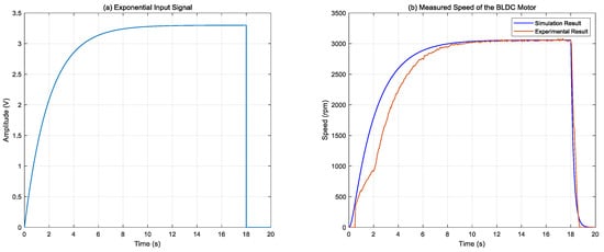 Simulated and experimental motor speeds under an exponential input signal. (a) Exponential input signal, (b) measured speed of the BLDC motor.