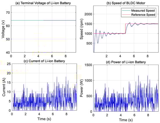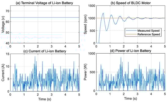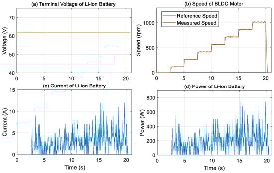 As shown in Figure 13a, the terminal voltage of the Li-ion battery remains stable at approximately 62.5 V throughout the test, indicating reliable voltage regulation, while Figure 13b presents both the reference and measured speeds of the BLDC motor. The measured speed closely follows the reference speed, demonstrating that the control system is well-tuned with minimal steady-state error.