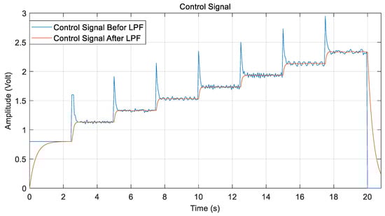 Figure 14 shows the behavior of the control signal in the BLDC motor control system before and after applying an LPF. Unfiltered control signal exhibits sharp high-frequency spikes and ripples, which are typical in control systems due to switching noise or sensor jitter. In contrast, the filtered control signal was significantly smoother and cleaner.