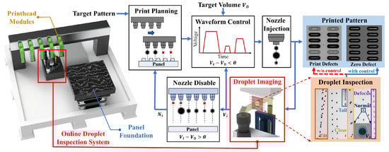 Specifically, as shown in Figure 1, a closed-loop control is employed to achieve zero-defect inkjet printing. First, the nozzles on the printhead modules eject droplets according to the planned printing pattern and the corresponding driving waveform. The embedded Online Droplet Inspection System (ODIS) then inspects the in-flight droplets to assess injection status, droplet volume, velocity, and ejection angle across all nozzles involved in the inkjet process []. The measured volume of each nozzle enables precise regulation of the inkjet driving waveform. In addition, ODIS identifies and disables abnormal nozzles based on measured droplet parameters, such as droplet volume , target volume , and threshold . It also provides feedback for printhead waveform regulation and inkjet print replanning with indexes of disabled nozzles . Together, these functions establish a vision-based closed-loop decision-making system for the zero-defect inkjet printing process [,].
