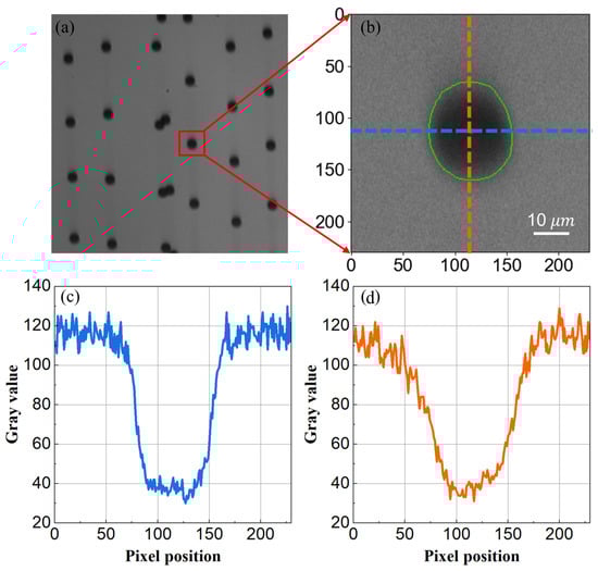 Gray value distribution of in-flight droplet image. (a) Inkjetted droplets. (b) Zoomed-in view of the droplet size. (c) Horizontal gray value distribution of the droplet image. (d) Vertical gray value distribution of the droplet image.