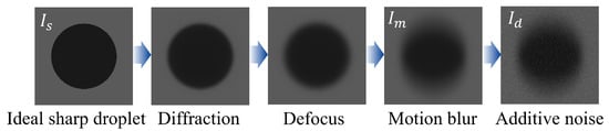 As illustrated in Figure 3, the ideal droplet image is sequentially downgraded by diffraction, defocus blur, motion blur, and adaptive noise, resulting in the degraded droplet image . The entire DGMN model of the droplet image can be represented as follows: