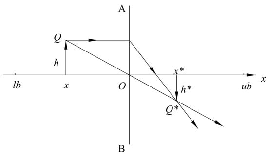 In Figure 4, AB represents the lens, and an object Q is positioned on the left side of the lens, whose height is . Through the lens, the Q has an opposite image Q* with height , whose projection on the X-axis is located at . The positional relationship between Q and Q* is described by Equation (6) as follows: