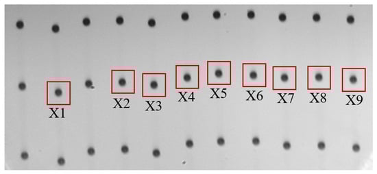 An ODIS, equipped with X DOF, includes an HIKROBOT industrial camera (MV-CH120-10GM, resolution, Hangzhou, China), a Navitar zoom lens (Rochester, NY, USA), and a high-power LED. The camera uses a 1 s exposure time with constant backlighting to capture high-speed shadowgraph images of droplets in flight, as shown in Figure 6. Utilizing known nozzle coordinates and DOF cooperation, all nozzles are inspected to measure droplet volume and speed and to identify abnormal nozzles for print planning and nozzle waveform regulation. Based on this setup, each printhead is moved to the ODIS system for inspection. Nozzles eject droplets at 14 kHz, and multiple droplets are captured for measurement. After the current nozzle set is inspected, the remaining nozzles are scanned sequentially along the XY DOF to complete the droplet image collection.