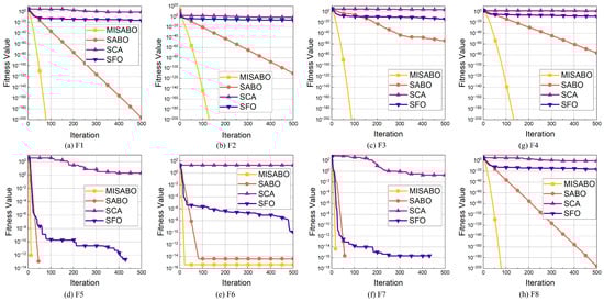 This section presents a benchmark evaluation designed to assess the performance of the proposed method using a variety of benchmark functions. The evaluation includes comparisons with several competitive metaheuristic algorithms, namely the original SABO (as the baseline), SCA [], and SFO []. A set of representative benchmark functions is employed, comprising unimodal functions (–) and multimodal functions (–), as shown in Table 1, to comprehensively evaluate the optimization capabilities of the proposed MISABO. Unimodal functions test convergence speed and accuracy, while multimodal functions assess global search ability. Each method was independently run 50 times across all benchmark functions, with a population size of 50 and 500 iterations. The applied performance metrics include mean (average performance), standard deviation (stability), and best/worst values (accuracy).