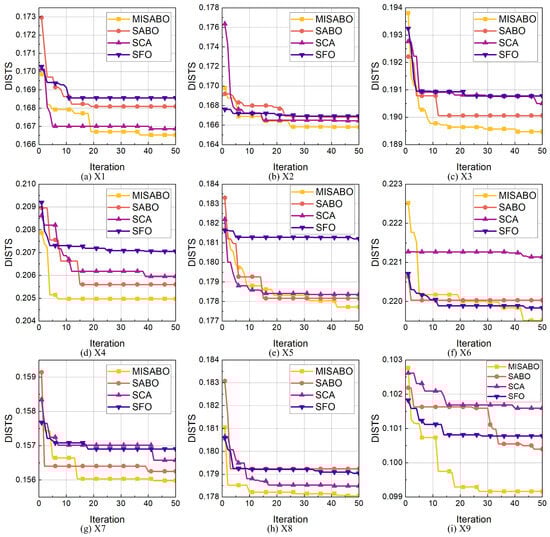 Figure 8 illustrates the convergence performance of the proposed MISABO algorithm in comparison with other optimization methods applied to the DGMN model for synthetic droplet image generation. As shown, MISABO consistently outperforms its competitors in final DISTS values across all image cases and presents better convergence speed in most images. For instance, in images X1 and X7, MISABO minimizes the distribution error within approximately 20 iterations. In images X3, X4, and X8, it achieves the lowest DISTS among all methods in just five iterations. For images X5 and X6, MISABO demonstrates effective multi-step convergence, producing the best degradation simulations after 40 iterations. In image X9, MISABO yields a significantly lower final DISTS after 50 iterations compared to other algorithms. The optimization results across all image cases, summarized in Table 4, further confirms that MISABO delivers superior performance in synthetic droplet image generation.