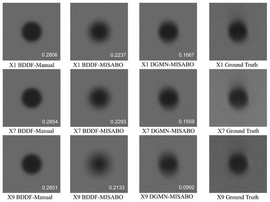 Synthetic droplet image experiments were conducted on 10 real droplet images () captured by ODIS, labeled X1 to X9 in Figure 6. MISABO and other algorithms optimized the DGMN model using paired synthetic and real droplet images. All search agents were normalized to () before optimization and denormalized for DISTS evaluation. Each algorithm ran independently on all images with 15 agents over 50 iterations. Table 3 details the DGMN control parameters and their levels.