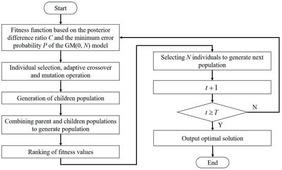 The genetic algorithm (GA) is an objective optimization method, which is developed based on the theory of biological evolution and genetics []. The MOGA is an improved multi-objective optimization method based on the GA. The posterior difference ratio C and the small error probability P are two key indicators for the accuracy test of the GM(1, N) model. Therefore, the posterior difference ratio C and the small error probability P work as objective functions to realize effective oil debris analysis. A weighting method for the MOGA is used here to transform multi-objective optimization functions into a single-objective optimization problem. To improve the optimization efficiency and accuracy of weight coefficients of the MOGA, an adaptive crossover and a mutation operator are used in this study. Moreover, an elite strategy for the MOGA is added to ensure the population diversity of the MOGA and accelerate the convergence rate. The flowchart of the MOGA for oil debris analysis is shown in Figure 2. Algorithm 1 presents the systematic implementation procedure for the MOGA-GM(1,N) model applied to oil debris analysis, outlining the sequential steps from variable definition through optimization convergence.