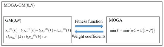 Considering the limited number of oil samples and nonlinear distribution of oil monitoring data, the GM(1, N) model is more practical and accurate than other traditional multi-variable linear methods for analyzing the relationship between multivariate parameters of small data samples. The MOGA has high adaptability to solve multi-objective optimization problems with enhanced parallelism and stability []. Therefore, the oil debris analysis method is proposed for multi-objective and multi-variable optimization based on a MOGA-GM(1, N) model. Detailed procedures of the oil debris analysis method are shown in Figure 1. The MOGA-GM(1, N) model is developed, in which the concentration of a common element of Fe serves as a dependent variable, and concentrations of other related elements, i.e., Ni, Cr, Al, Mn, and Mo, serve as independent variables. An optimal weight coefficient of the concentration of each related element to the Fe element can be obtained by the MOGA with the minimum posterior difference ratio C and the maximum small error probability P as optimization objectives.