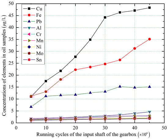 The spectral data of wear elements of the gearbox in oil samples were obtained by using a SPECTROIL Atomic Emission Spectrometer, as shown in Figure 5. The spectral data of the wear experiment of the gearbox are listed in Table 3. The variation tendency of element concentration demonstrates that concentrations of Cu and Fe elements are larger than others in oil samples, as shown in Figure 6. Oil samples from 1 to 9 in Table 3 are extracted after the gearbox operates with running cycles of its input shaft of , , , , , , , , and , respectively.