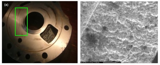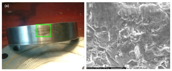 Gear wear experimental results of the gear pump: (a) wear condition with green frame highlighting the analyzed wear region and (b) micrograph showing detailed surface morphology of the wear region.